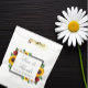 O design apresenta girassóis, rosas e margaridas elegantes com uma paleta de cores de outono em amarelo dourado, vermelho e branco. O design também apresenta uma moldura cinza carvão. Você pode alterar a cor do fundo na frente e no verso para a cor de sua escolha ou deixar ambos configurados para branco.