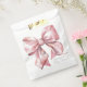 Um design de sacola de lembrancinha de festa encantador, apresentando um grande laço rosa em aquarela centrado na frente. O nome da futura mamãe é exibido em uma fonte serifada clássica na parte inferior, com "Baby Shower" elegantemente escrito abaixo em caligrafia manuscrita.