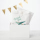 Este chá de fraldas bonitinho e moderno, que favorece o saco, apresenta um viagem de avião azul, com céu azul e nuvens. Também há espaço para você adicionar seus próprios nomes/texto.