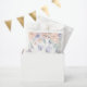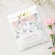 Papel de chá de fraldas de borboleta giro favorece bolsas com flores de água roxas e cor-de-rosa com letra de caligrafia.
