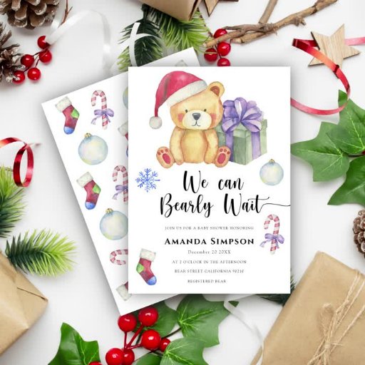 chá de fraldas. Celebre com esta festa de chá de fraldas do urso de pelúcia de inverno! Ursinho de pelúcia bonitinho com presente de natal, com chapéu de Santa. No verso do cartão estão os padrões de natal de feriado (cana doce, brinquedo de árvore de natal, meias de natal). Itens correspondentes disponíveis.
