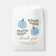 Chá de fraldas de abóbora azul cai bem favorece bolsas. Este design apresenta uma fonte moderna de escrita de caligrafia, abóboras e ramos verdes de Eucalipto.