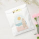 Este surf bonitinho e moderno, bolsa de favores de praia, apresenta uma prancha de pau na praia com conchas espalhadas.