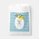 Um design elegante de Chá de Panela com fundo de azulejo azul e um copo de limões.