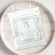Bolsas de lembrancinhas de chá de noiva elegantes com molduras de água-viva em verde vintage e floral azul inspiradas no grandmillenial, um delicado laço de água-viva azul, "amor + agradecimento" exibido em uma caligrafia azul elegante, e o nome da noiva e a data do chá em tipografia serif clássica.