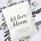 Simples, na moda, dia de casamento "deixe o amor florescer", um saco de favores em um estilo moderno de design minimalista com uma tipografia escrita à mão em preto clássico e branco escrito em um estilo informal informal. O texto pode ser facilmente personalizado para um único design único para o seu dia especial. O favor perfeito para o casamento para a natureza, jardinagem e amantes de flores (sementes de flores não incluídas)!