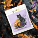 Um gato preto para o halloween com uma abóbora laranja, vela, rosa púrpura escura e folhas de outono num pano de fundo púrpura claro em estilo gótico.
