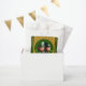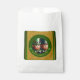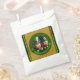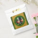 Leprechaun miniatura em 3D + "Dia de São Patrício feliz" em um círculo verde + papel texturizado do ouro (imagem impressa) como fundo. Design na bolsa de favor.