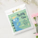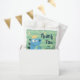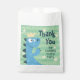 Um saco de bonitos favores para a festa de aniversário de um menino, este design tem um T-Rex azul no estilo de desenho vestindo uma coroa dourada com um fundo listrado verde com estrelas amarelas e um confete espalhado. O obrigado do texto pode ser personalizado com o texto desejado ou ordenar o item com o texto, conforme mostrado. É uma ideia fofa para uma festa temática de dinossauros para crianças pequenas.