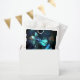 Duas libélulas transparentes, luminosas, turquesas, desenhadas artisticamente sobre fundo noturno, com algas e vagalumes luminescentes do lago. Dragonfly brilhante.