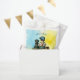 Obrigado por vir ao nosso saco de chás de fraldas. Chá de fraldas de baseball azul e amarelo. Um menino vintage sentado ao lado de um cachorro, um laboratório negro com um boné de beisebol, taco e luva. Fundo azul e amarelo.