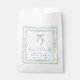 Elegantes sacolas de lembrancinhas de chuveiro de noiva com molduras de aquarela florais em verde vintage e azul inspiradas no grandmillenial, um laço azul delicado de coquette em aquarela, "amor + agradecimento" exibido em uma elegante caligrafia azul, e o nome da noiva e a data do chuveiro em tipografia clássica serif.