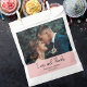 Compartilhe sua gratidão com esta elegante bolsa de casamento “Amor e Agradecimento” Rosa Corado. A frente apresenta sua foto de casamento favorita junto com seus nomes e data personalizados, criando um presente sincero que seus convidados vão amar. Perfeito para embrulhar pequenos presentes, doces ou tokens de agradecimento de forma elegante, significativa e lindamente pessoal.