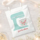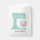 Esta bolsa de lembrancinha personalizada apresenta uma batedeira azul aqua com a frase "Espírito de Confeitaria Brilhante" com cores alternadas e detalhes cintilantes. As cores incluem rosa, vermelho, verde e azul claro. Você pode personalizar com seu sobrenome, tornando-a a bolsa perfeita para embalar seus produtos de confeitaria!