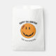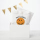 vestido para o halloween com um sorriso assustador de abóbora e cicatriz costurada na testa neste design de papel amigável." Feliz Dia das Bruxas juntamente com um nome é um texto opcional e pode ser editado usando o modelo fornecido. Procure ID224 para ver outros produtos com este design.