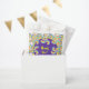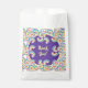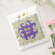 Arcos-da-chuva divertidos no círculo roxo em uma bolsa bonito de favor branca com um grande "obrigado você" amarelo.