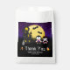 Esta bolsa de favor divertida e assustadora apresenta vampiros bonitos ao lado de uma casa assombrada. Ao fundo está uma lua de cheio com morcegos e um céu noturno roxo com estrelas. O texto combina fontes decorativas e serif para um aspecto na moda e moderno. Isto é perfeito para uma festa de aniversário temática de Halloween.