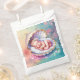 Os favores do Chá de fraldas da garota. Tema do chá de fraldas branco, cor-de-rosa, púrpura, lacado e costeiro azul. Uma garotinha dormindo dentro por um tempo e uma concha de ouro. Água azul bonito do oceano com flores tropicais de cor aquosa branca.