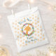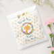 Obrigado por bolsas por chá ou aniversário. Projetado com uma ilustração de uma linda face girafa sorridente, cercada por uma coroa de flores tropicais aquáticas. Colorida e fofa. O fundo é um padrão desbotado com manchas brancas laranja.