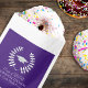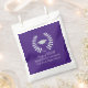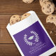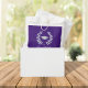 Este design apresenta um saco de lembrança de festa de graduação. Lembrança de agradecimento da turma, parabéns, um design elegante para o ensino médio ou faculdade, com tipografia clássica e sofisticada, uma caligrafia moderna e elegante, em cor roxa. Ótimo para lembranças de graduados, com um pendão e um chapéu de caixa escolar, coroa de folhas de louro, biscoito.