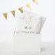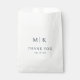 Esta bolsa de lembrança de casamento apresenta um design minimalista com um layout limpo e centralizado em um fundo branco. A tipografia serifada em negrito destaca as iniciais "M" e "K", separadas por uma linha vertical, seguidas pela frase "OBRIGADO" em letras ligeiramente menores. Abaixo, uma data personalizável adiciona um toque pessoal a esta peça elegante. O texto preto monocromático cria um visual sofisticado e profissional, perfeito para expressar gratidão em seu evento especial.