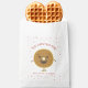 Ilustração de um waffle em forma de coração com calçados rostos, braços e pernas vestindo cercado por confetti. O texto diz, "VOCÊ É UM AMIGO DE BOAS VANTAGENS" O lado oposto é um padrão de faixa vermelha esmaecida