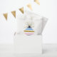 Estilo moderno de médio século, bolbo de ornamentação da árvore de Natal com faixas irregulares em azul claro, simulação de brilho dourado, rosa e marinho azul com bolinhas brancas. Tampado com um arco brilhante simulado e azul e rosa. Colocado em branco sólido. Personalize com seu nome ou mensagem na fonte de escrita manual do serif azul escuro.