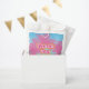 O favor da festa "Obrigada" cor-de-rosa é uma adição divertida para uma despedida de solteira com o nome da futura noiva embaixo. O fundo é colorido com palmeiras azuis, amarelas e rosas.