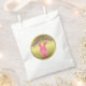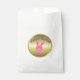 Um adorável saco de favores de Páscoa (perfeito para os pequenos colecionarem seus mini ovos na caçada de ovos da Páscoa!) que apresenta um doce coelho rosa da Páscoa com um cachecol em volta do pescoço. Acima dela está a saudação em roxo, "Felz pascoa" (que pode ser personalizado para o bem) e atrás dela está um círculo brilhante de ouro.