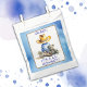 Oh, rapaz, é um Cowboy Lil! Ameixas de chá de fraldas azul e marrom, com um menino pequeno em um chapéu de vaqueiro sentado com um ursinho de pelúcia, trem e pintinho de bebê. O chá de fraldas do garoto rústico do campo e oeste.