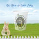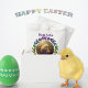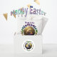 Um pintinho de bebê adorável se senta numa cesta de ovo de Páscoa. Adicione seu nome na parte inferior.