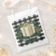 O presente de pacote favorece este feriado com uma Xadrez de Buffalo. O design de bolsa de favores apresenta um presente de Natal embrulhado em listras, enfeitado em verde de Natal contra um fundo de gingham preto e branco. Itens adicionais de presentes e feriados disponíveis com este design também.
