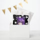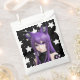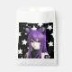 Menina de anime branca, negra e roxa, com banda de ouvido de orelhas de raposa e bolsa de aniversário estrelada.