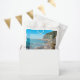 Esta design de praia apresenta uma costa rochosa. O cenário pitoresco combina verde, oceano azul, costa rochosa e areia ouro. A formulação é elegantemente enquadrada por um simples fundo branco opaco de fronteira. Este é o perfeito design de casamento de destino de praia ideal para um casamento de verão ou à beira-mar. O elegante e romântico casamento de praia favorece o design com elementos modernos. Os convites de casamento e outros artigos de papelaria também estão disponíveis.