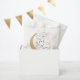 Design apresenta uma lua de ouro falsa com "Estamos sobre a lua" em um texto de caligrafia fofo. Personalize com suas informações ou clique em "Clique para personalizar mais" para editar estilos de fonte, tamanho e cores.
