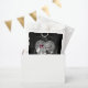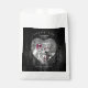 Esta coleção de casamento temática gótica e escura é adequada para qualquer época do ano, incluindo Dia dos Mortos, Dia de los muertos e Halloween. O conjunto apresenta crânios, esqueletos, quadros de rolagem de ornamentado e flores esmagadas, todas em preto e prata, com sotaques arrojados. Os esqueletos enfeitiçados no arco, no bigode e no bigode, todos em um fundo cardíaco resmungado, somam ao humor gótico desse saco de favores. Adicione sua mensagem, nomes e data de casamento usando o modelo fornecido. Procure ID866 para ver outros produtos e opções de cores para este conjunto de design.