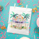 Fala de praia, tema de aniversário, bolsas apresentam um paraíso tropical com sol, mar, palmeiras e uma prancha adornada com um cartaz de "Surf para Cima", lanternas de cordas, hibisco e folhas de palma. As cores são neutras em termos de gênero, o texto pode ser personalizado para se adequar a qualquer pessoa e idade - crianças ou adultos, e estas bolsas favoritas irão adicionar alguma atenção de verão à sua celebração. Arte por KL Stock