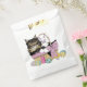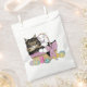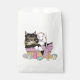 Gato de mesa marrom, bonito, sentado numa cesta de páscoa, com um arco cor-de-rosa e um coelho branco recheado de páscoa. Ovos de páscoa em toda a cesta de Páscoa.