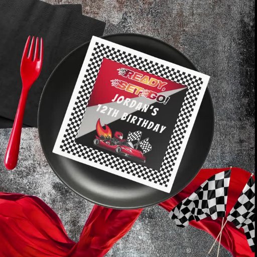 Corrida para comemorar um aniversário de corridas de kart. Esta design festa de aniversário apresenta um kart vermelho e preto com uma unidade de capacete vermelha e chamas atirando na parte de trás do kart. As palavras "Pronto, Preparado, Ir!" também são feitas em um gradiente em tons de chama. Um par de sinalizadores marcados estão desligando o driver.