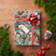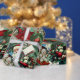 Father Christmas surrounded by greenery, with flowers, angels, children and ornaments in bright reds and greens.
