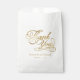 A wedding favor bag featuring a white background with the words "Thank You" in faux gold foil and space for the names and wedding date of the bride and groom.