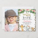Floral e foliage safari temem dois convites de aniversário selvagens com foto. Esta design apresenta uma borda padrão de pele de leopardo ou chita, assim como três animais de safari fofos.