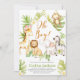 Este é um convite de chá de fraldas fresco com animais de açari fofinho, arranjados com folhas tropicais frescas de verde