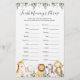 Os animais Safari têm o cartão de jogo de final de mamãe com o tema chá de fraldas apresenta uma ilustração de animais safari com cores aquáticas e verde-aquarelas eucalyptus garland e uma elegante letra de estilo manuscrito.