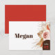 Um elegante design de casamento Escort apresenta um belo buquê cártaro de flores do deserto e uma personalizável tipografia vermelha e enferrujada.