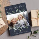 Festivo e elegante em tons de jade verde-claro, cinza e branco, nosso cartão com fotos de férias do Winter Sage apresenta sua foto favorita orientada para horizontal ou paisagem, formada por folhas botânicas verdes esboçadas em um fundo azul marinho dramático e profundo. O "Feliz Natal" aparece no topo da escrita de caligrafia moderna. Personalize com sua saudação personalizada, nome da família ou nomes e ano na parte inferior.