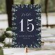 As placas de números de tabela botânica elegantes apresentam uma borda de folhagem de cor d'água esboçada e verde, moldando seu número de tabela em branco em um fundo azul rico em marinho. Personalize com seus nomes e data de casamento, ou nomeie cada mesa para um toque pessoal extra. Design repete-se no lado oposto. Coordena-se com a nossa suíte de convites para o casamento do Winter Sage.