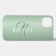 Girly Sage Green Monograma Name Cell capa de telefone em um plano de fundo de cintura. Esta capa de telefone moderna de células na moda ajudará a expressar seu estilo exclusivo. Personalize com seu próprio nome e monograma.