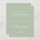 Um simples cartão verde para o casamento, com o nome do convidado e o número da mesa impresso na sua frente, os nomes da noiva e do noivo e a data do casamento impressa no outro lado (isto é, a outra metade, antes de dobrá-la). Todo texto é um script caligráfico branco. Tamanho: 4,5" x 5,6" antes da dobragem, ou seja, 4,5" x 2,8" após a dobragem.
