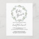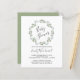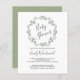 Um convite para chás de fraldas botânicos, neutro em termos de gênero, que apresente uma coroa de folhagem de aquarela em tons de verde-sábio e cinza. O texto é cinza de carvão/sans não-pretas, com destaque para a caligrafia de estilo de escrita manual. Personalize-o com os detalhes do seu chá de fraldas. O reverso é uma sombra correspondente de verde sábio.